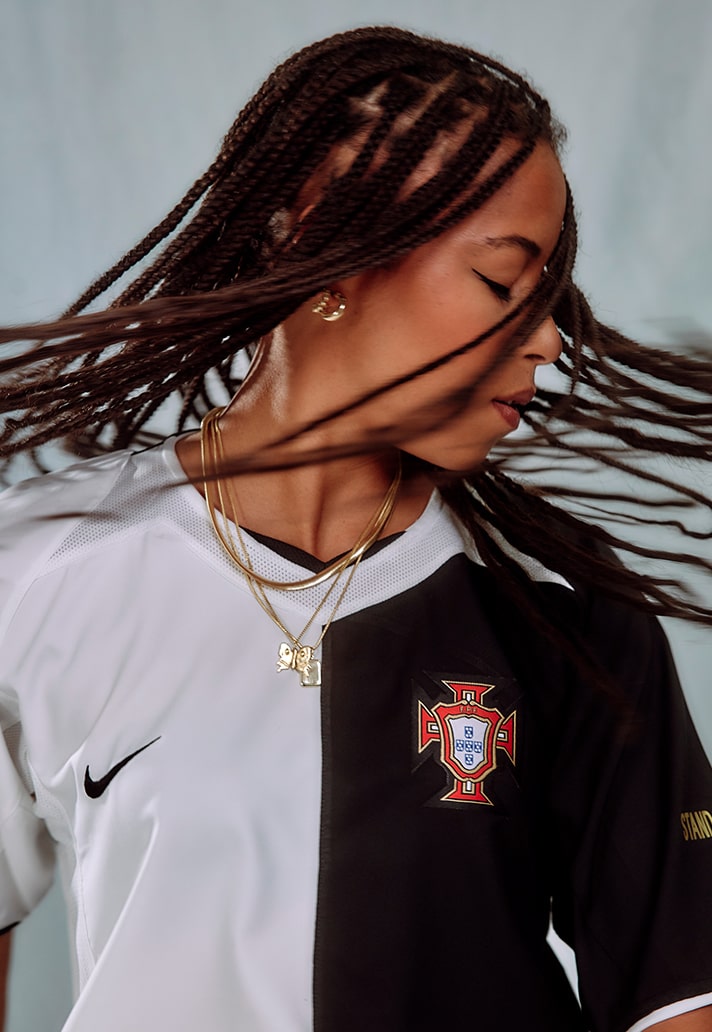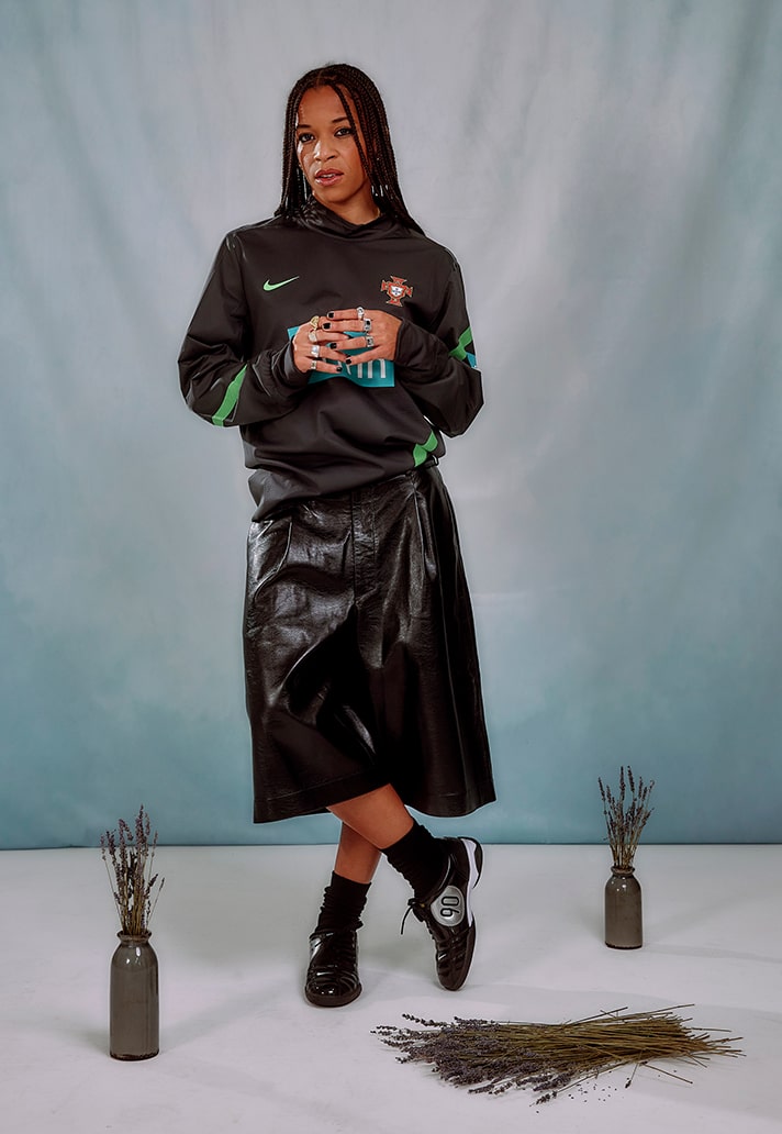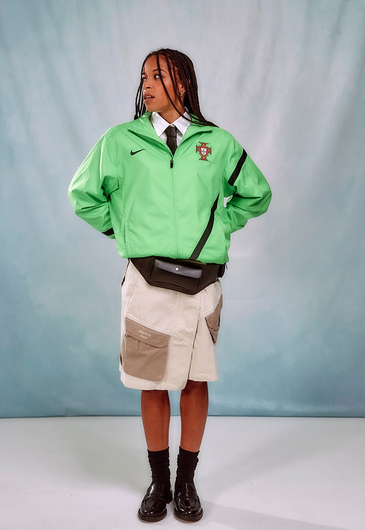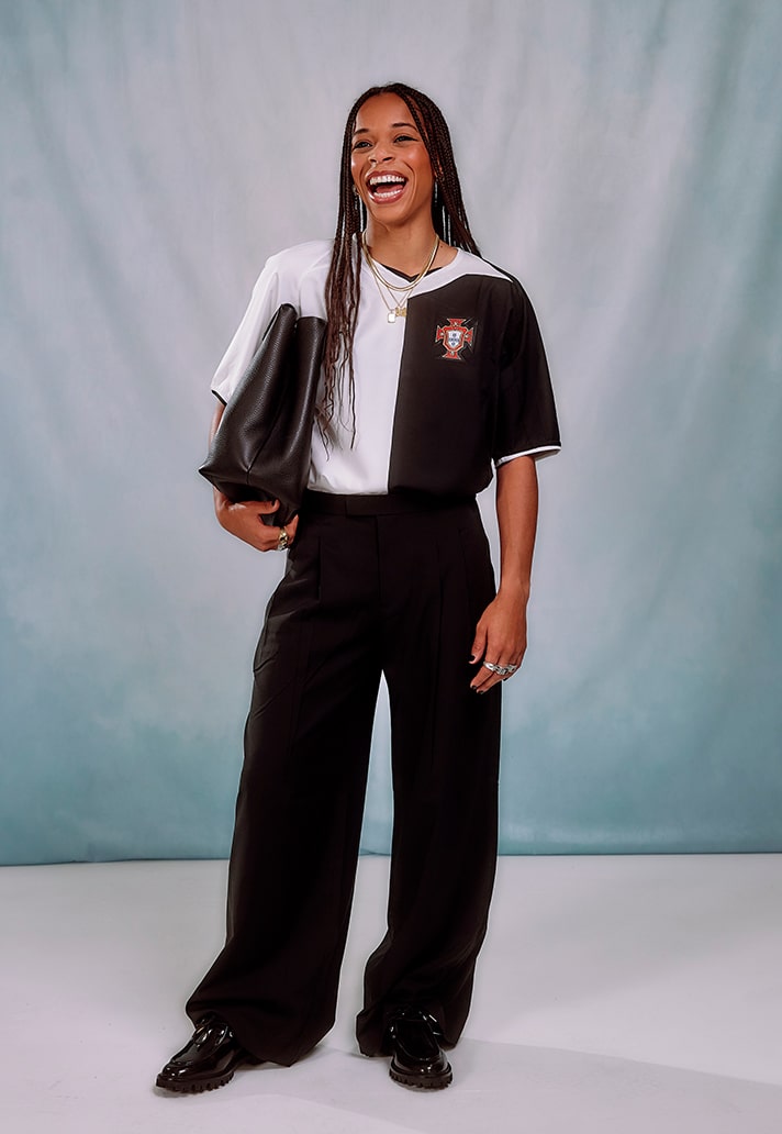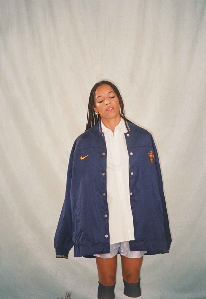 Their most recent project brings them together with Portuguese International and Gotham FC winger, Jéssica Silva. Silva is no stranger to creative expression on and off the pitch, showing her flair and skill during 90 minutes to then rocking her own unique style outside the stadium walls. Saudade House have chosen to tell a story about Jéssica’s lifestyle through this project, highlighting culture and heritage fused with contemporary fashion.