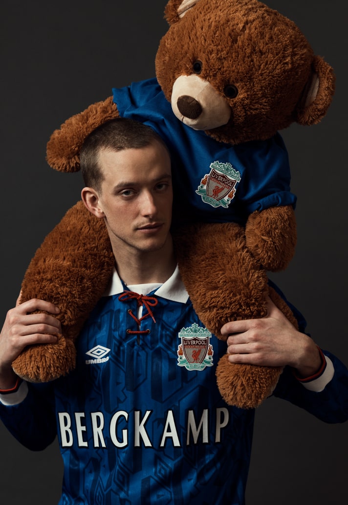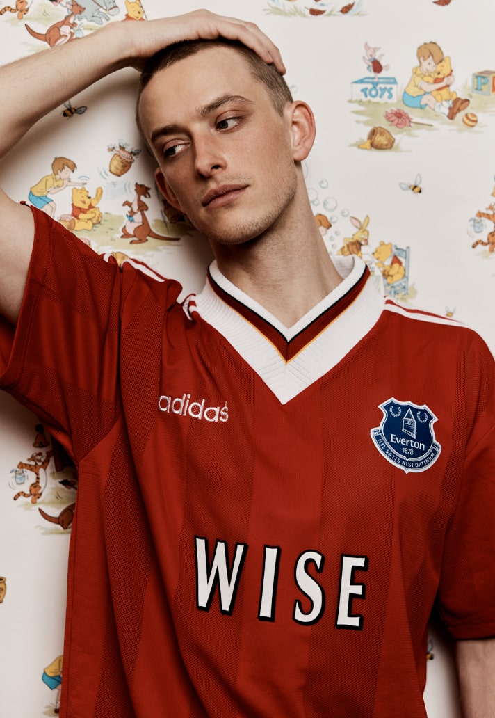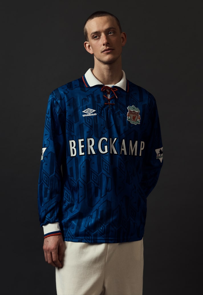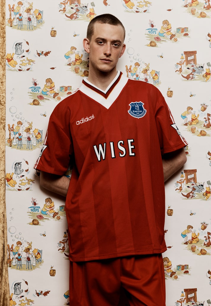 Georgi Kinkladze, Manchester City hero from yesteryear, on a Manchester United shirt but with a Chelsea badge? Or a Liverpool shirt with Everton crest featuring “Wise”? Then take the names from their usual position on the back and slap them front and centre for a jarring take. And finish by mixing up some of the traditional colours...it all contributes to that feeling of wrongness, of unease with what you're looking at. And that's exactly what Bedford is gunning for...