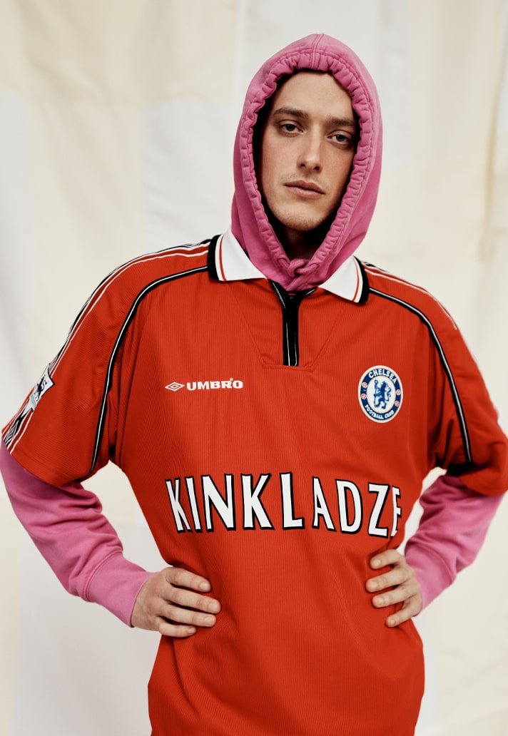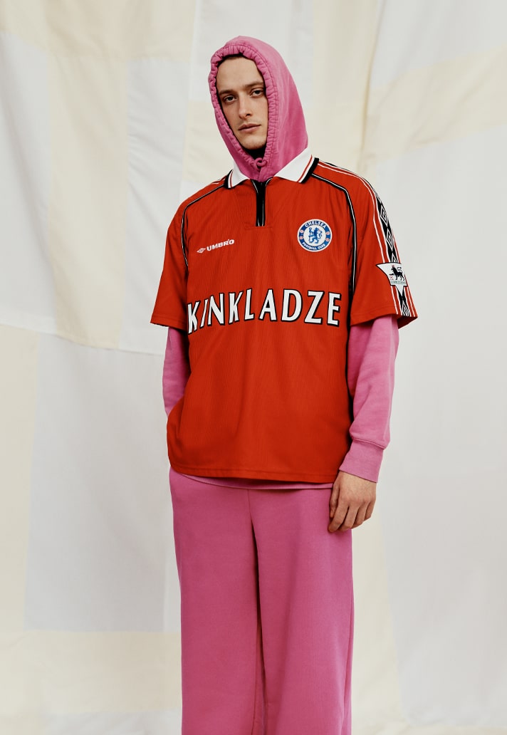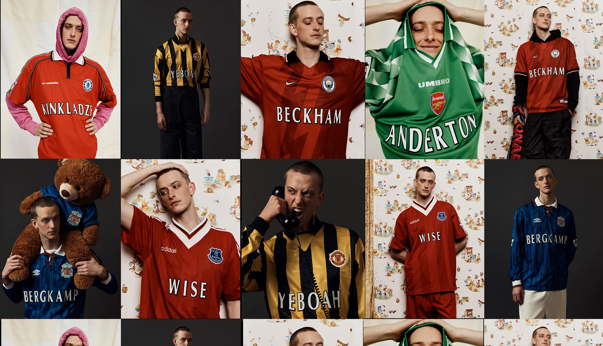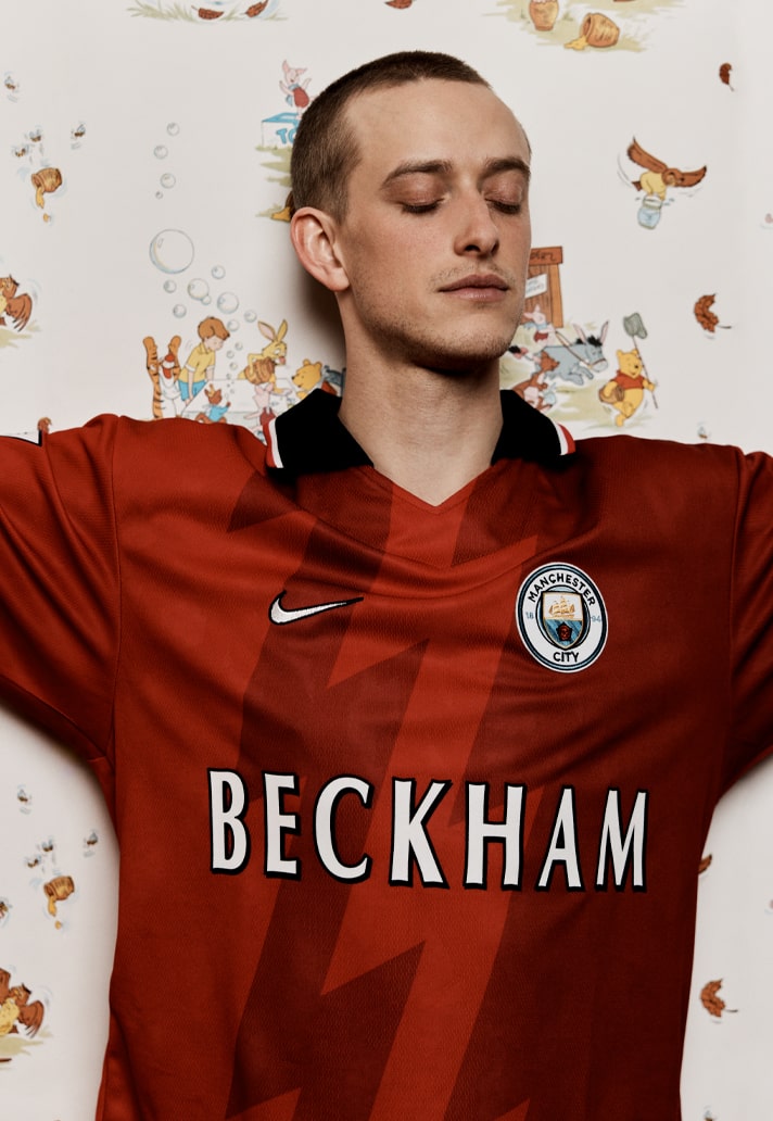 Georgi Kinkladze, Manchester City hero from yesteryear, on a Manchester United shirt but with a Chelsea badge? Or a Liverpool shirt with Everton crest featuring “Wise”? Then take the names from their usual position on the back and slap them front and centre for a jarring take. And finish by mixing up some of the traditional colours...it all contributes to that feeling of wrongness, of unease with what you're looking at. And that's exactly what Bedford is gunning for...