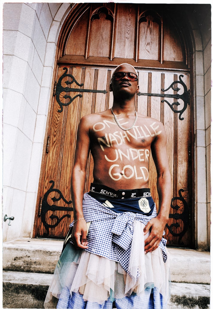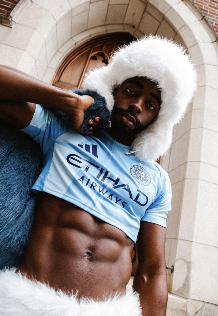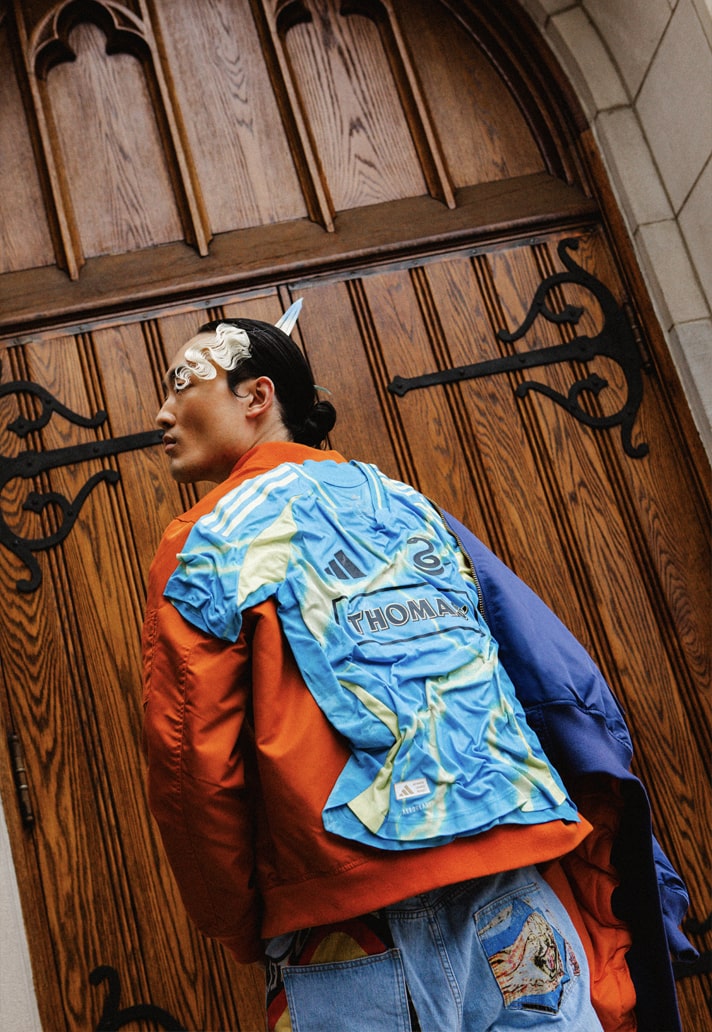 Playing into the club’s chrome branding and woven tagline, this design reimagines jerseys into a custom interlocked jacket and pant set, merging futurism with craftsmanship.