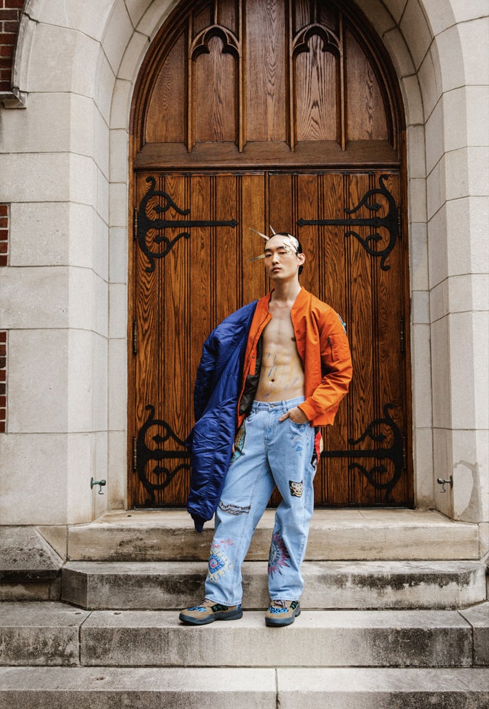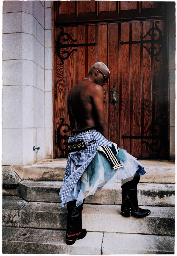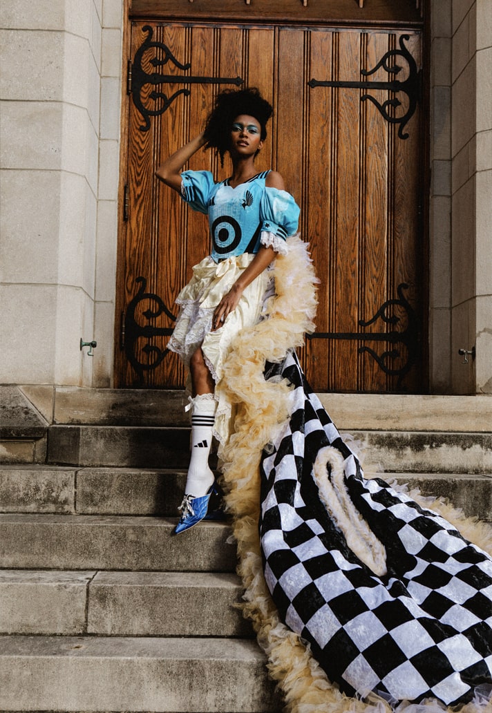 Referencing Miguel Adrova’s Fall 2012 collection—the first upcycled football collection—this look embraces sustainability and reinvention.
