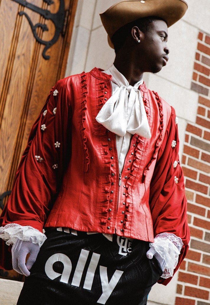 Taking cues from Jeremy Scott, this look includes a custom beret, blazer, and bag, all repurposed from the team jersey to create a high-fashion ensemble.