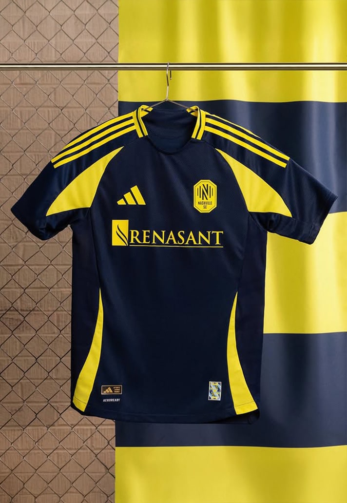 Feels like a bit of a let down after seeing how Columbus Crew designed their jersey in similar colours. Inspired by Nashville's vibrant art scene, the jersey is fashioned in a deep navy base and solar yellow accents. I will give credit to the detailing on the back of the collar though, the word 'Nashville' is merged into music sound wave lines in the shape of a heart. Lovely detailing.