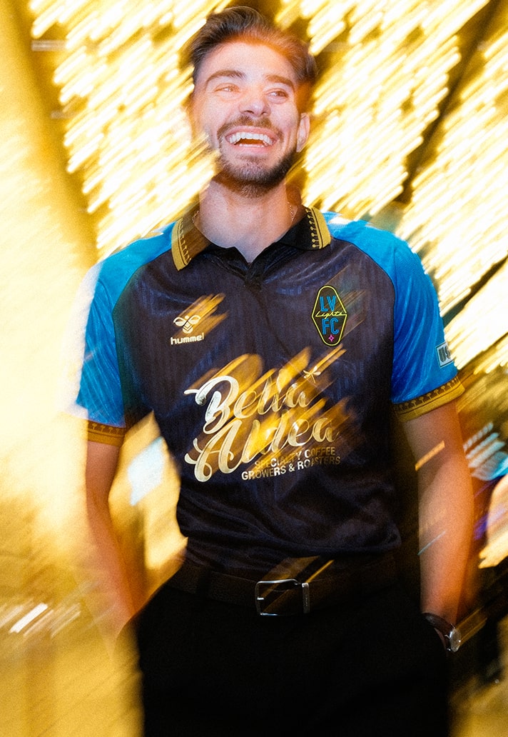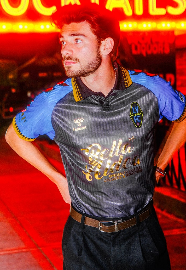 The LV Lights FC crest arrives in typical Vegas fashion once again, paired next to a golden hummel badge. Another badge of the kit provider can be seen on the hip, fashioning the LV lights diamond – a motif that can be seen all around the city, from the blackjack tables to the shape of the ‘Welcome’ sign.