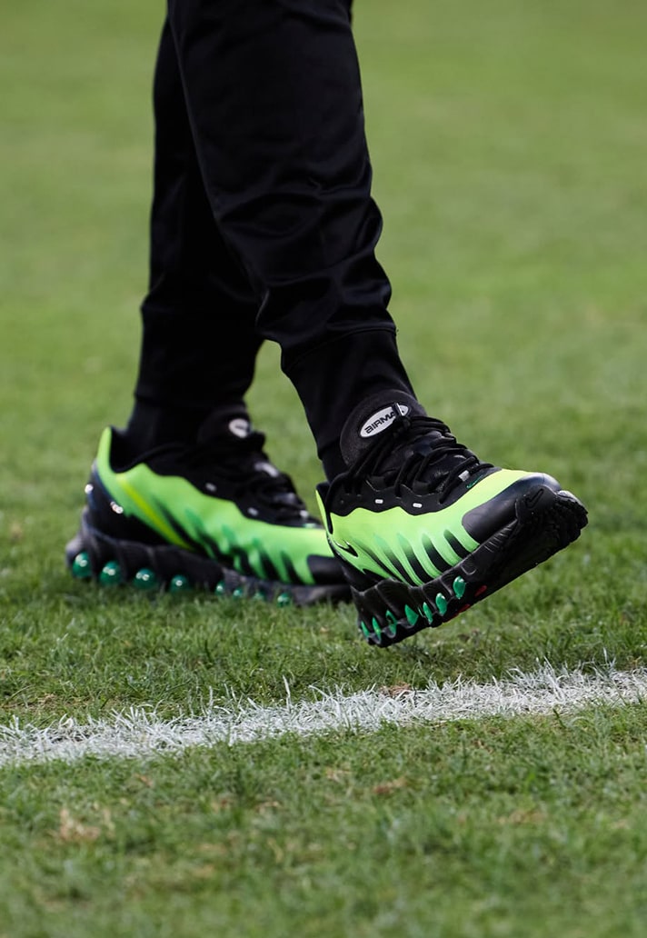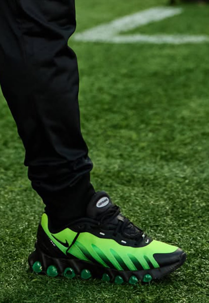 The Air Max Dn8 is an innovative design from Nike, crafted with a soft breathable upper which complements the Dynamic Air technology. The model embodies the ideas of fluidity and motion through a sleek, modern look, and it now sees another colour update with this bold new look spotted on the feet of the Aussie. The Dn8 model features are engulfed in a neon lime green, that moves subtly into a more saturated shade towards the back of the shoe, blended with black accents and sole – giving off a futuristic and high-performance aesthetic.
