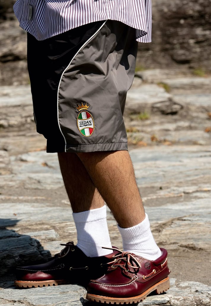 The collection is made up of track jackets, shorts and jerseys. The track jacket arrives in two different colourways, a classic blue and a black/grey, in an almost identical to the legendary 90’s drill top. In typical Kappa fashion, the esteemed Omini logo adorns the sleeves, complemented by a bespoke Sedan All-Purpose crest which draws inspiration from some of the most renowned Serie A clubs. A pair of matching shorts complete the look.