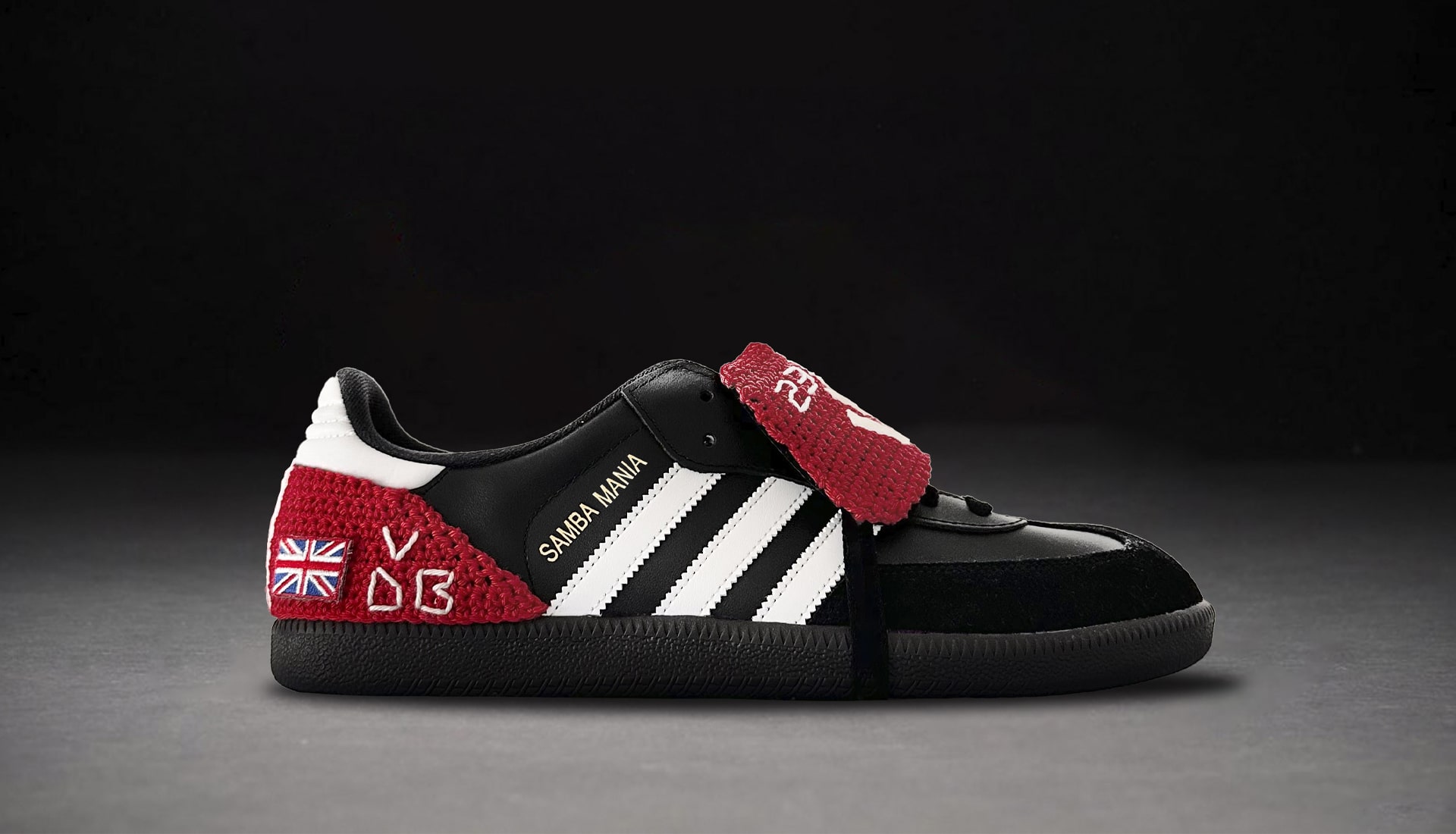 Through the use of handmade crochet and embroidery, the Samba Mania, as it has been dubbed, captures all elements of Beckham’s Predator Mania (red tongue, red heel with Three Stripes, elastic to hold the tongue down) and was further embellished with embroidery of the names of his four children, his and Victoria's initials, the Union Jack and Italian flags, and the numbers 7 and 23.
