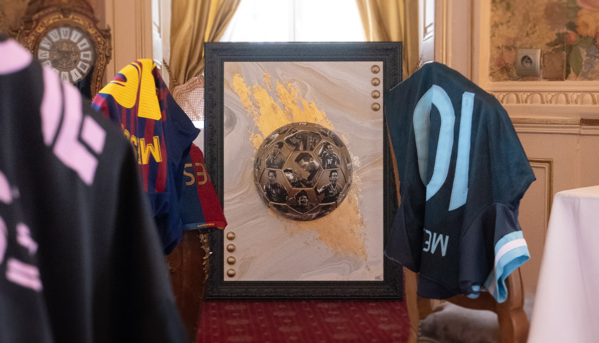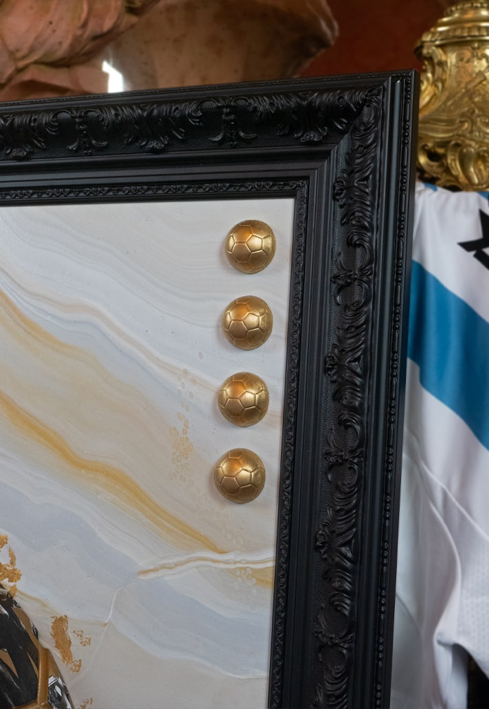 Keeping focus on Messi, Mats worked on a brand new unique stand that he 3D printed, then sanded and spray painted, giving a background made from acrylic and gold leaf. There were apparently a lot of complications in preparing the ball, particularly with fixing it in place without damaging the canvas or the support. But once that was complete the detail was added, capturing some of Messi’s most magical celebratory moments. The piece was finished with eight small golden balls – split into four and positioned in opposing corners – to represent his eight Balon d’Ors.