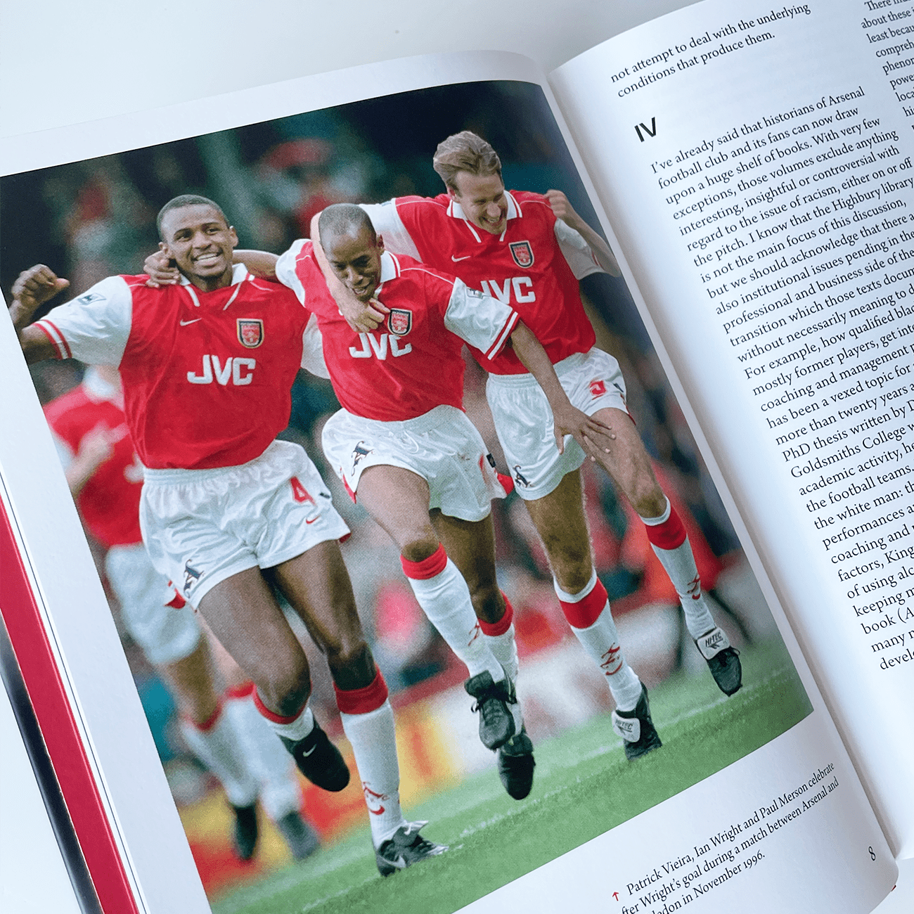 Black Arsenal is physically weighty too (1340g) and worthy of any shelf and coffee table. It mirrors Black Britain, a book by Nwonka’s mentor Professor Paul Gilroy, in terms of striking visuals and hundreds were painstakingly sourced and licensed. The academic built his own extensive digital archive as he researched and there are some mind-blowing images levelling up the premium red and white-tinged design – the stadium murals in Ruben Dangoor’s chapter, the Observer magazine’s Black Britons front page (1971), plenty of intimate moments and iconic goal celebrations. Recent events heightened my reaction to the Far Right image on page four. “I think it was 1973 and it’s important because we often get a romantic idea about Arsenal and North London as a multicultural melting point but Islington was a National Front hotbed,” Nwonka explains. Excelling visually and intellectually in 66 x 202 x 32 mm, one can dip in and out of satin-like pages chronicling the past 50-something years.
