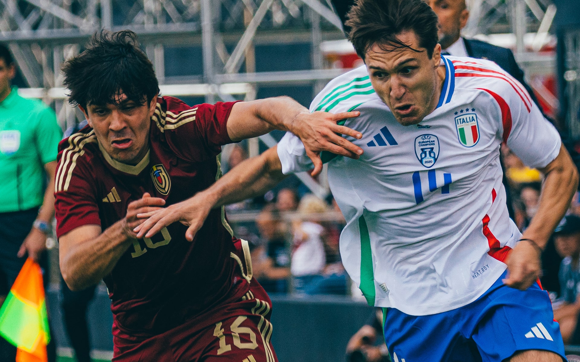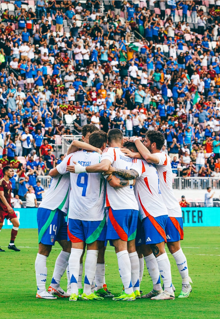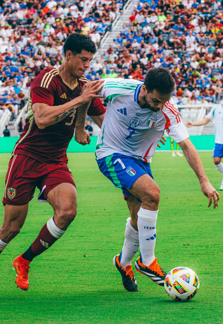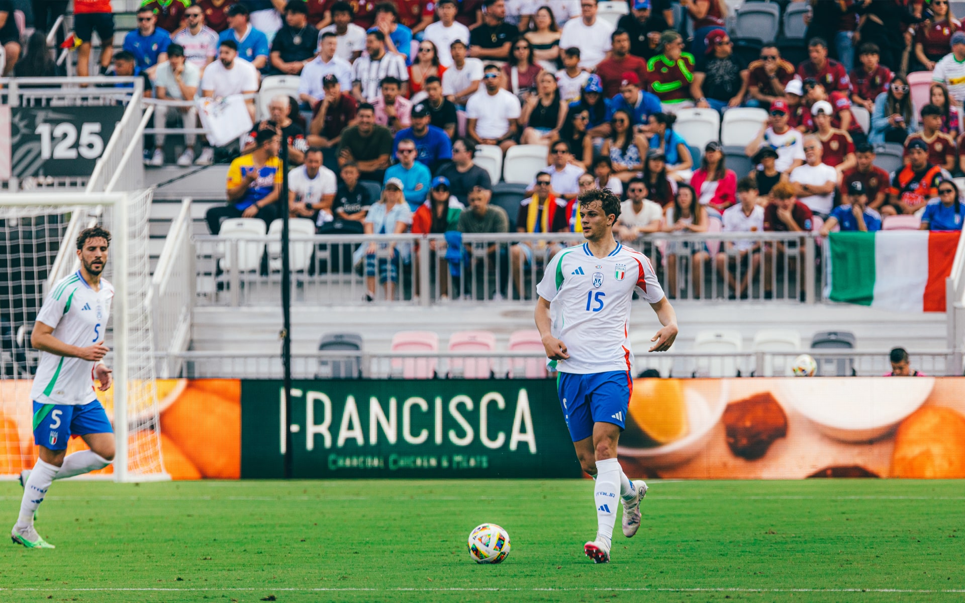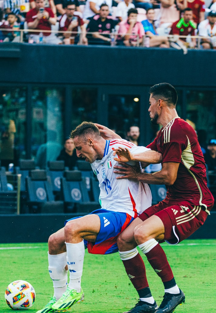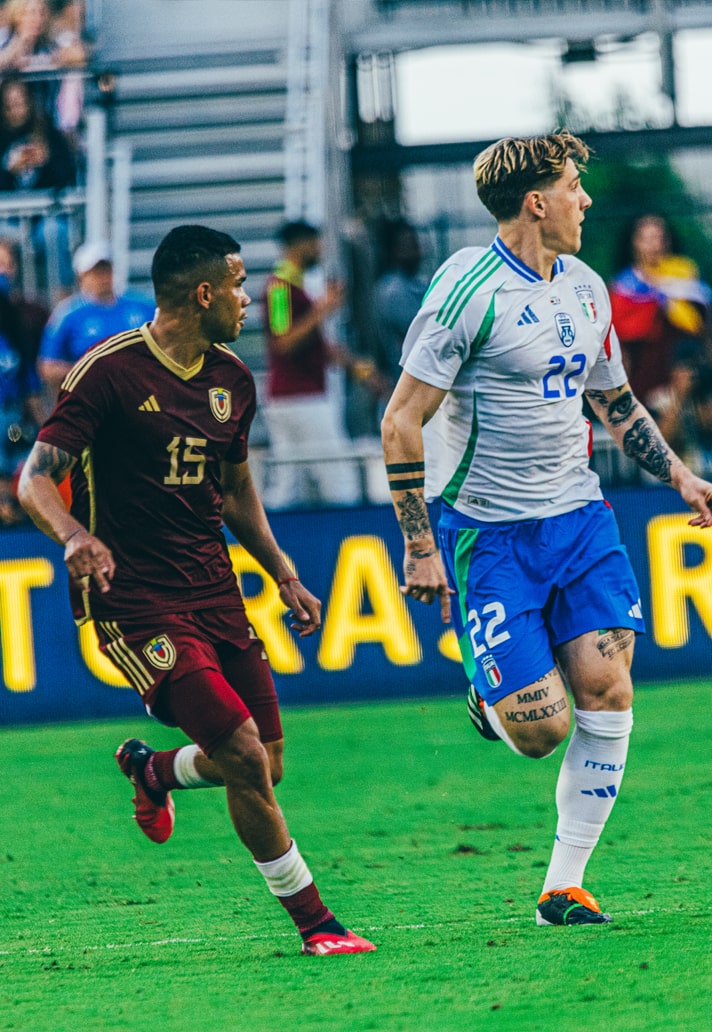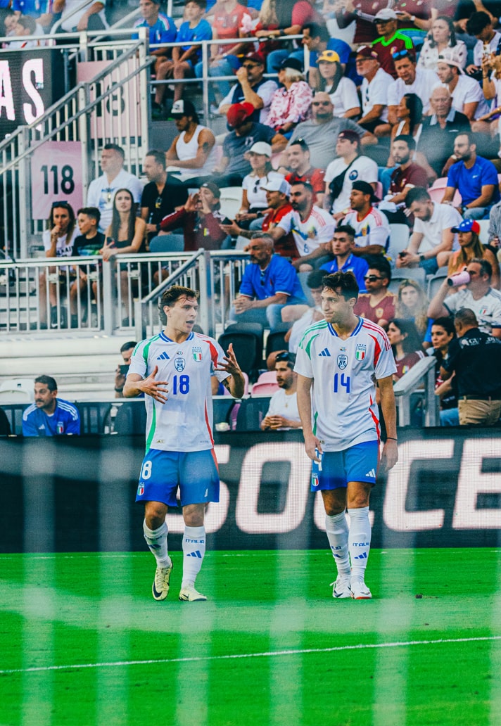 Decked out in their new adidas away shirt for Euro 2024, their first opponents were Venezuela, who used the fixture as preparation for their participation in Copa America 2024. The game took place with South of Florida as a backdrop, and a vibrant Chase Stadium witnessed quite the game. The energy of the fans from both teams was electrifying, with the stands decorated in a sea of blue and maroon jerseys, representing the Azzurri and La Vinotinto.