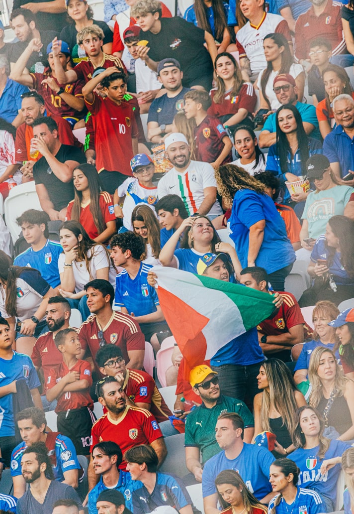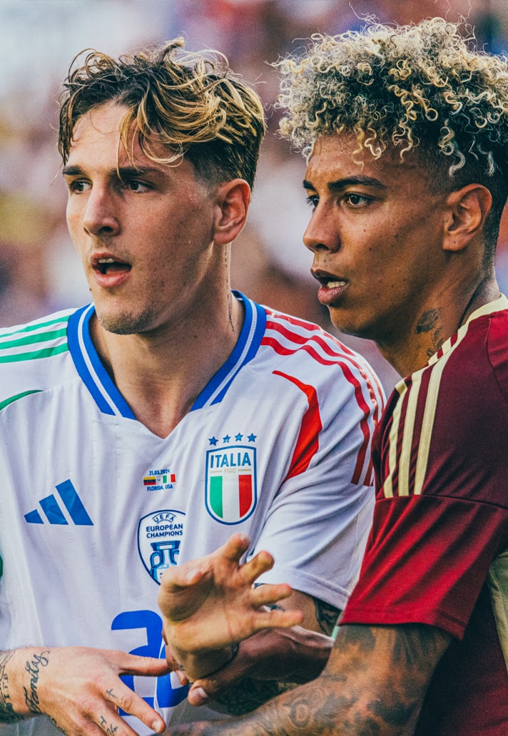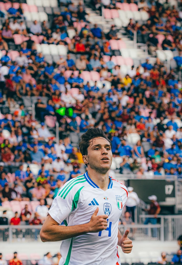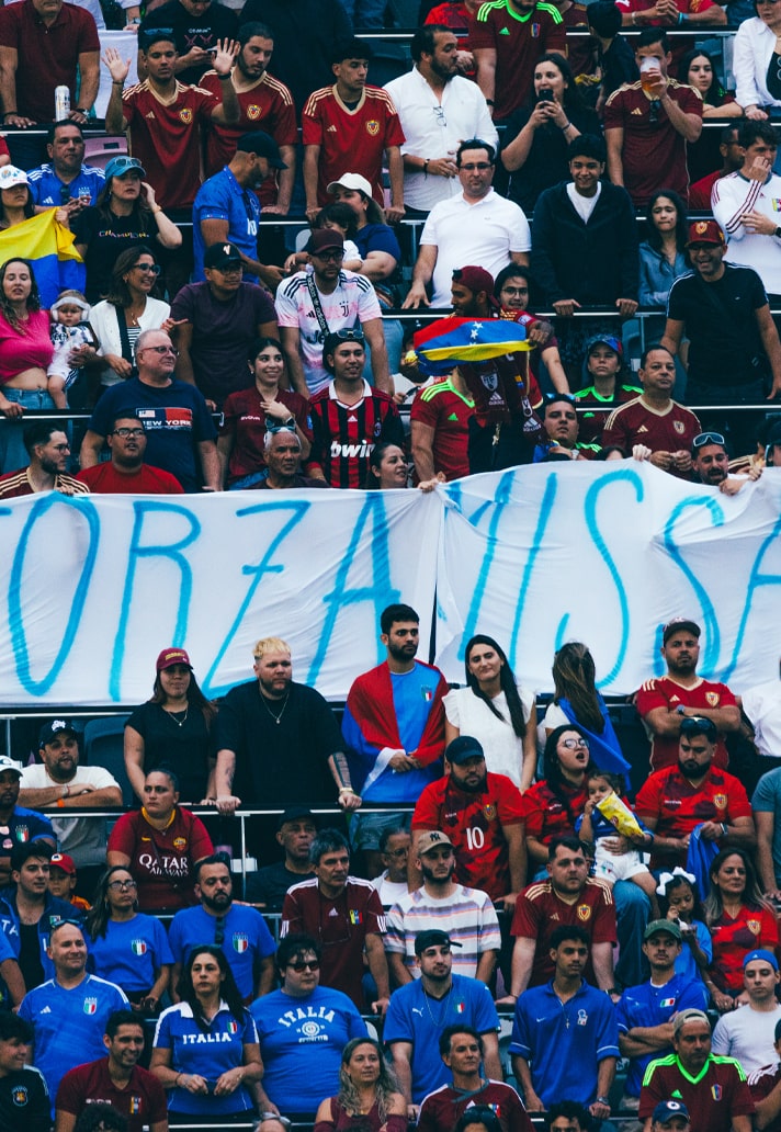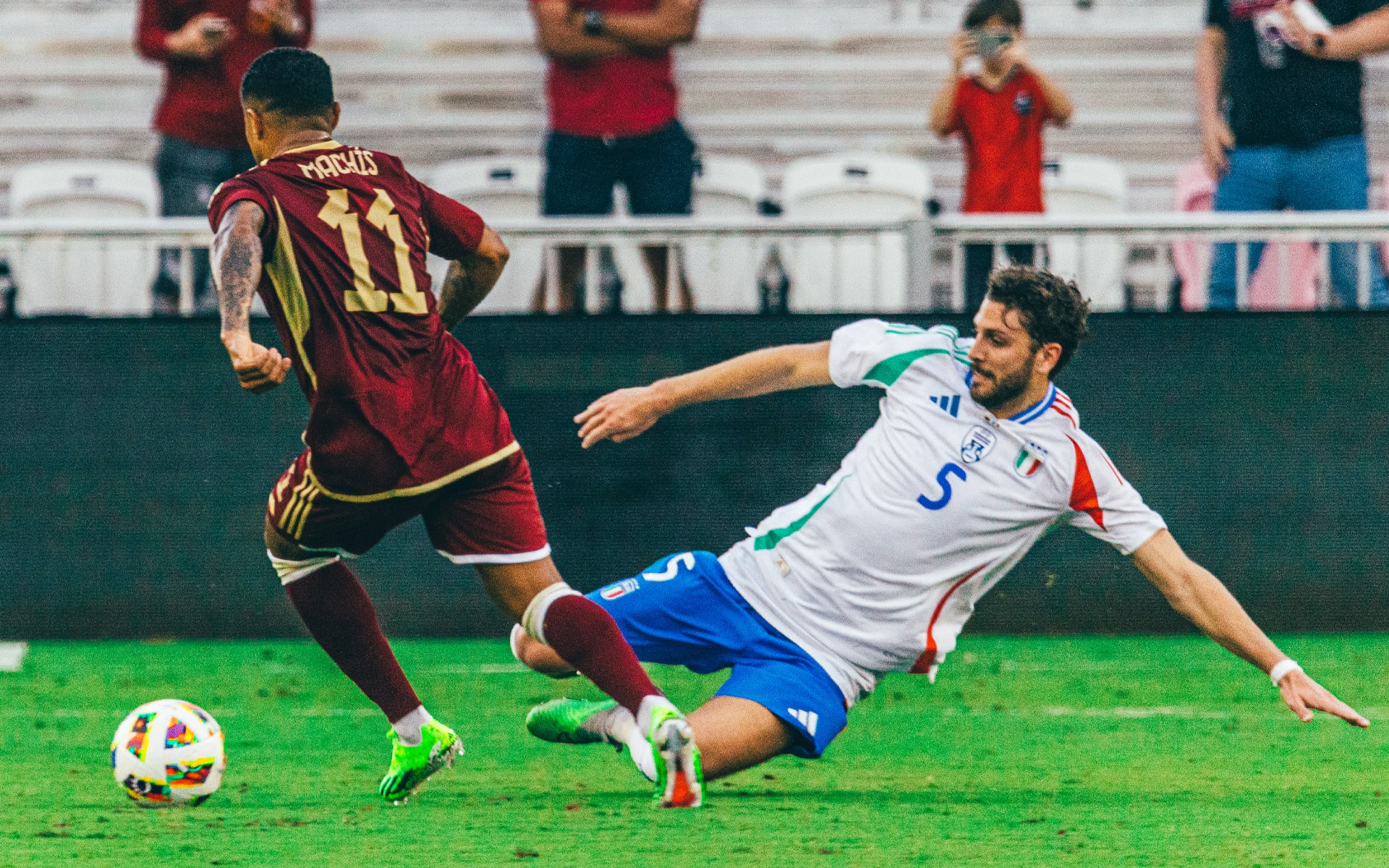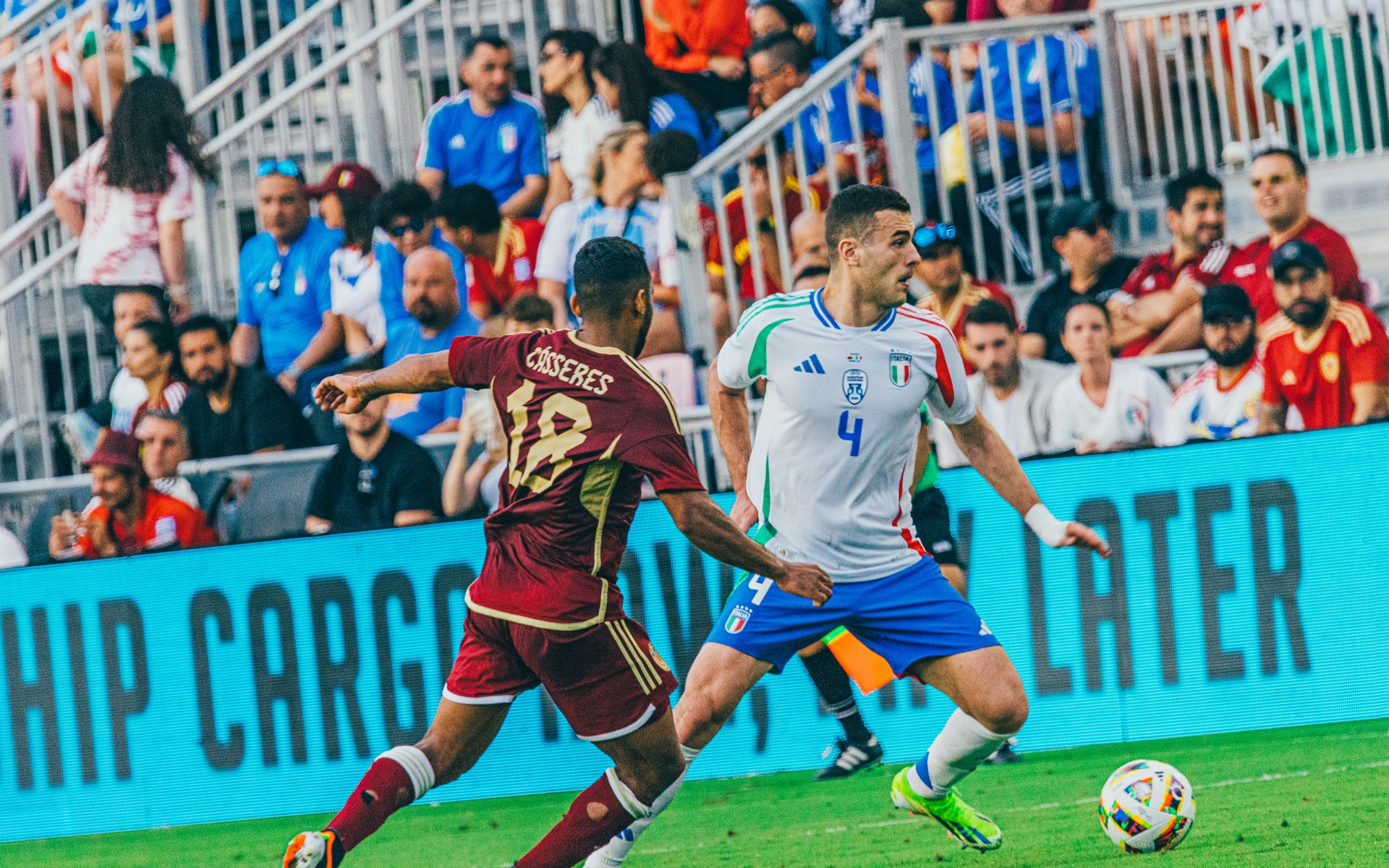 Decked out in their new adidas away shirt for Euro 2024, their first opponents were Venezuela, who used the fixture as preparation for their participation in Copa America 2024. The game took place with South of Florida as a backdrop, and a vibrant Chase Stadium witnessed quite the game. The energy of the fans from both teams was electrifying, with the stands decorated in a sea of blue and maroon jerseys, representing the Azzurri and La Vinotinto.