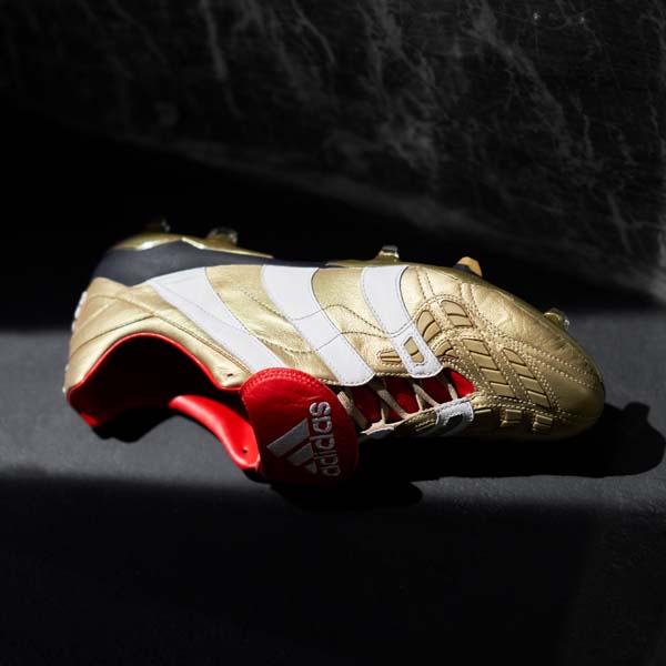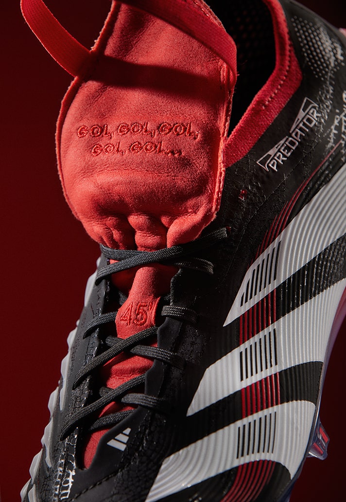 Aside from that classic colourway, the design sees the original Predator logo adorning the side of the boot – those iconic eyes back in place – while the famous ‘100% legal, 0% fair’ tagline features on the soleplate. Underneath the classic red tongue includes tributes to iconic goals from the careers of David Beckham and Zinedine Zidane. The right boot features a 93’ timestamp and infamous “raised the roof here with a goal” commentary of Beckham’s free-kick to send England to the FIFA World Cup and the nation into raptures, while the left boot includes a 45’ timestamp and ‘GOL GOL GOL’ commentary from Zidane’s ridiculous volley for Real Madrid in the 2002 UEFA Champions League final.
