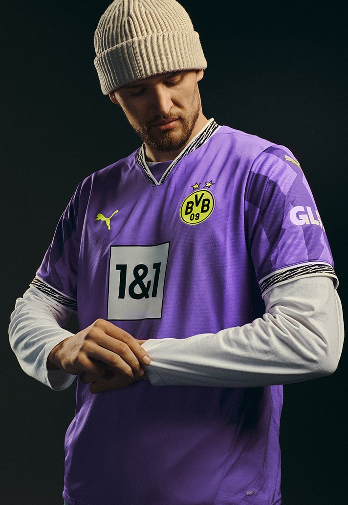 The jersey itself arrives in a neon yellow base, taking over most of the shirt. Black patterns create a disruptive design across the sleeves, on both short and long version. A v-neck collar fashions a zebra-like pattern, which also features on the sleeve cuffs. Black again adorns the Puma logo and BVB crest, sticking to the neon yellow and black colourway. The goalkeeper kit takes on a different colourway, modelling a smooth purple with the same detailing on the collar and sleeve cuffs.